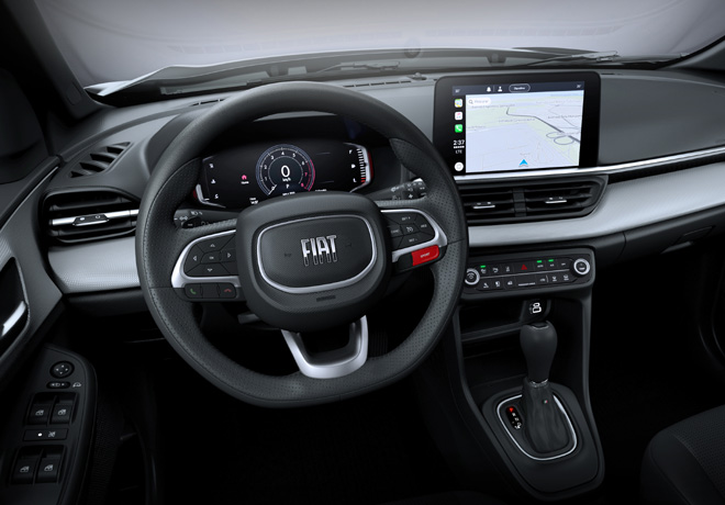 Con un interior único dentro de la gama Fiat, el Pulse cuenta con un nuevo volante deportivo multifuncional con base plana y detalles cromados, que imprime el Nuevo logo script «FIAT» en el centro, además de la tapicerÃa de cuero con costuras visibles.