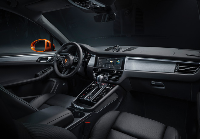 El nuevo Porsche Macan ofrece un interior sustancialmente mejorado, con una consola central de diseño moderno y elegante. Su nuevo concepto de funcionamiento, que emplea superficies táctiles en lugar de botones, proporciona una estructura limpia al habitáculo. También es nuevo el selector del cambio, más corto y situado en el centro del bien organizado módulo de control. El reloj analógico en la parte superior del tablero forma parte del equipamiento de serie. Como opción, hay varios paquetes de tapicerÃas de cuero y costuras de contraste en azul Gentian, Papaya o Crayón para dar colorido al interior. El Macan continúa ofreciendo de serie muchas funciones y servicios que pueden ser controlados a través de la pantalla táctil de alta definición y 10,9 pulgadas del Porsche Communication Management o mediante comandos de voz. El Macan incorpora los nuevos volantes GT Sport y multifunción que también utilizan los 911.