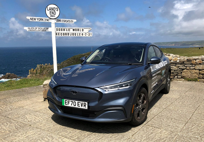 La hazaña se llevó a cabo en la famosa ruta que atraviesa Gran Bretaña de norte a sur. A bordo de un Mustang Mach-E, un trío de especialistas en conducción eficiente recorrió un total de 1.352 kilómetros en dos días partiendo desde el pueblo de John o’ Groats (Escocia) hasta Land’s End