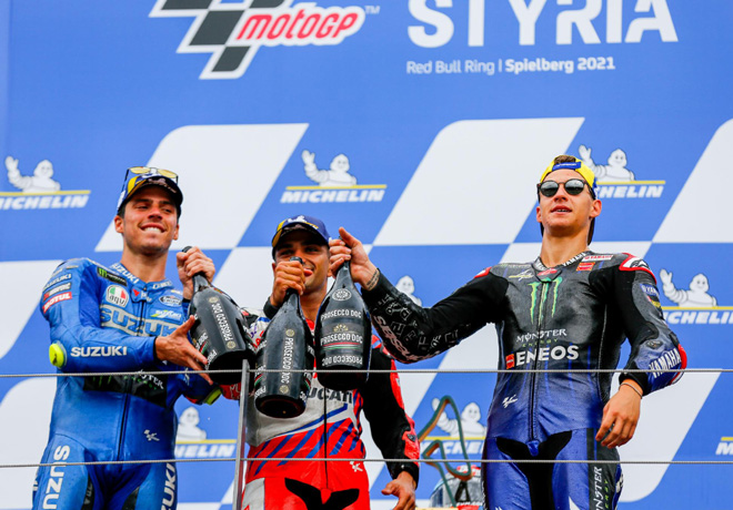113 dÃas después de aquella caÃda que cortó de raÃz la ilusionante dinámica que arrastraba desde Doha, ‘Martinator’ saboreó la gloria con su primer triunfo al subir a lo más alto del podio del GP de Estiria en compañÃa de Joan Mir (Team Suzuki Ecstar) y el lÃder, Fabio Quartararo (Monster Energy Yamaha MotoGP).