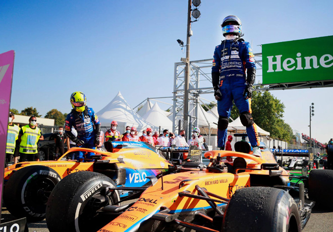 Daniel Ricciardo y Lando Norris fueron protagonistas de un impresionante 1-2 de McLaren, consiguiendo una victoria espectacular en el Gran Premio de Italia disputado en legendario circuito de Monza. El piloto australiano aventajó a su compañero por 1.747, logrando además el punto por haber realizado la vuelta más rápida.