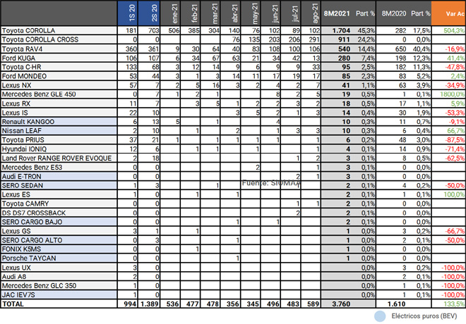 La Asociación de Concesionarios de Automotores de la República Argentina (ACARA) informó que el número de vehículos híbridos y eléctricos patentados en los ocho meses transcurridos del año creció un 133% de forma interanual al alcanzar las 3.760 unidades contra las 1.610 de los ocho meses de 2020. Las ventas en agosto alcanzaron las 589 unidades, el máximo histórico, superando las 483 unidades de julio y creciendo un 22%.