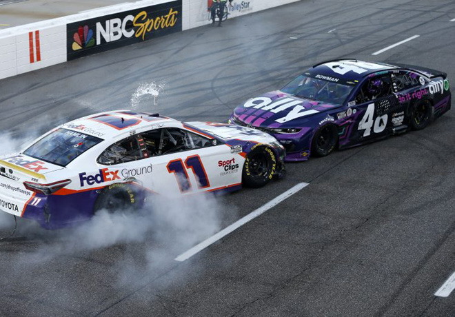 En la punta, la lucha estaba planteada entre Denny Hamlin (Toyota) y Alex Bowman (Chevrolet), pero un exceso en la defensa por parte de Hamlin, y otro exceso en el ataque de Bowman durante la vuelta 494 de 501, hicieron que ambos autos se tocaran y terminara con un trompo del hombre de Toyota que llegó a rozar, con la parte trasera de su auto, a la pared.