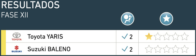 El Suzuki Baleno, fabricado en India, con dos bolsas frontales como equipamiento estándar obtuvo 0 estrellas. El modelo popular compacto obtuvo 20,03% en Protección Ocupante Adulto, 17,06% en Protección Ocupante Infantil, 64,06% en Protección a Peatones y Usuarios Vulnerables de las Vías y 6,98% en Sistemas de Asistencia a la Seguridad.