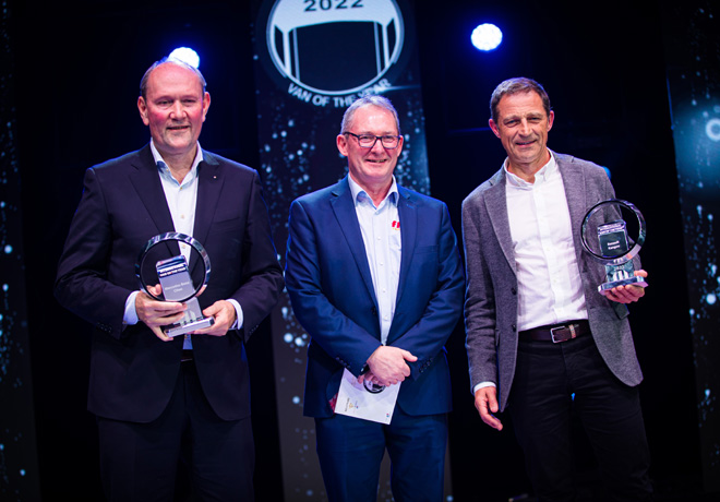 Durante la feria Solutrans en Lyon, el Sr. Jarlath Sweeney, Presidente del jurado de IVOTY, entregó a Mark Sutcliffe, SVP, LCV Business Unit, Renault Group, el premio International Furgón del Año 2022 por el nuevo Renault Kangoo.