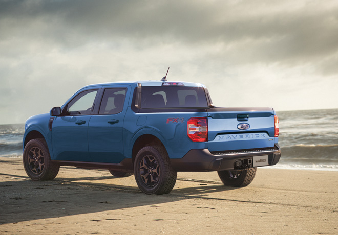 En cuanto a su diseño exterior, la Nueva Maverick presenta un diseño robusto resaltando todos los atributos característicos de una pick-up Ford. La parrilla posee una barra transversal cromada, espejos exteriores y manijas de puertas en color carrocería y un imponente formato y diseño de faros con iluminación LED. Esta pick-up presenta una línea frontal horizontal que se extiende de borde a borde para enfatizar su porte. La forma de la línea del contorno a lo largo de las puertas delanteras hace homenaje a las exclusivas ventanas laterales de la Serie F.