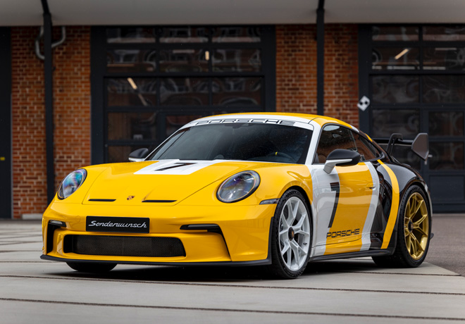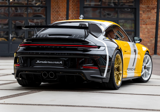 Una de las características especiales de este 911 GT3 es su llamativa pintura exterior en amarillo, blanco y negro, que reinterpreta el diseño con franjas de distinto color del histórico auto de carreras.