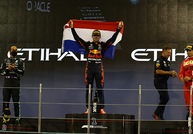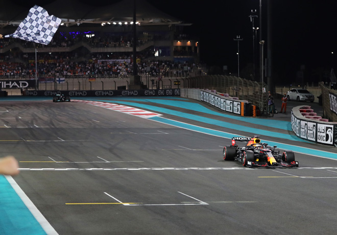 Max Verstappen aseguró su primer campeonato mundial con la victoria en el Gran Premio de Abu Dhabi, lo que marcó el final de la presente temporada, y Lewis Hamilton culminó segundo cuando la carrera terminó en un sprint de una vuelta tras un último Auto de Seguridad.