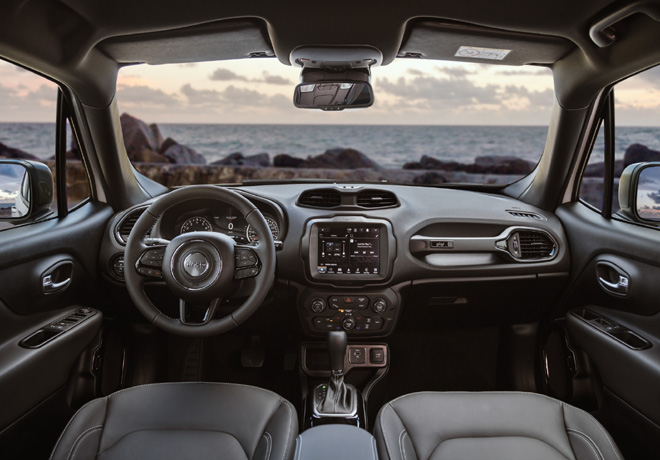Además, el revestimiento interior de techo es color negro y los tapizados en cuero presentan el emblema característico de esta versión. En términos de equipamiento, el nuevo Jeep Renegade Anniversary presenta en su interior un espejo retrovisor electrocrómico con sensor crepuscular, un tablero digital TFT a color de 7″ para el conductor y el sistema Uconnect de 8,4’’ con conectividad Apple CarPlay y Android Auto.