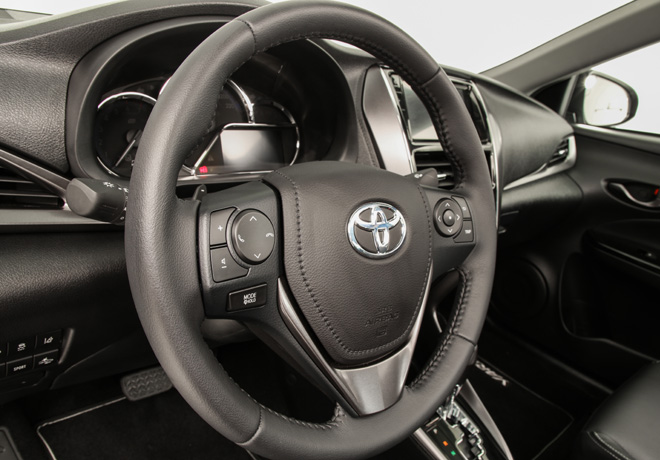La elegancia de las terminaciones internas son un punto destacable en el nuevo Yaris, que cuenta con dos tipos de acabado de asientos. Las versiones XS y XLS, tapizado en tela de color negro; las versiones XLS Pack y S, por su parte, cuentan con tapizado en cuero natural y ecológico de color negro. En el último caso, además, agrega costuras en color rojo que realzan su carácter deportivo.