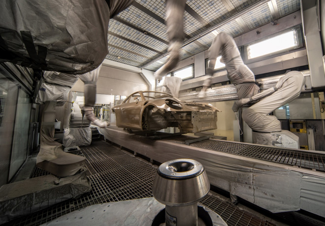 Antes de su ensamblaje en 117 etapas, el chasís del 911 pasa más de un día siendo preparado en el taller de carrocería y pintura. Uno de los desafíos de pintar vehículos y desarrollar acabados de pintura es conseguir que el resultado sea óptimo en todo tipo de materiales. La carrocería de un vehículo consta de varios componentes distintos, entre ellos, acero, aluminio, fibra de carbono o polipropileno. Los lotes de pintura deben adaptarse a todos ellos por igual y ser capaces de generar el mismo color.
