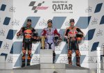 La primera curva del trazado catarà también se cobrarÃa las caÃdas de Alex Márquez (LCR Honda Castrol) y Miguel Oliveira (Red Bull KTM Factory Racing), al tiempo que Pol Espargaró podÃa presumir de una renta de un segundo en cabeza a falta de 10 vueltas. Un giro después, Bastianini daba caza a Binder y se colocaba 2º con Pol en un horizonte cada vez más próximo. Con el paso de las vueltas, la ventaja del ’44’ caerÃa en picado, a medida que perdÃa neumáticos y nivel de combustible. A ritmo de vuelta rápida, el italiano recortarÃa medio segundo en una vuelta para superar a Pol a falta de 4 giros a final de recta, cuando el de Granollers se irÃa algo largo, viéndose también superado por Binder. Afianzado con una renta de más de un segundo, Bastianini no perdonarÃa para saborear su primer triunfo, pese a los desesperados intentos finales de Binder, provocando el delirio en el box del equipo Gresini, con Nadia Padovani, viuda de Fausto, a la cabeza. Una tarde para la historia.