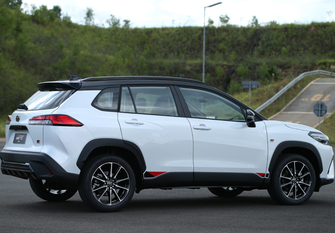 En la carrocería, la versión tiene un alerón trasero exclusivo, pintura exterior bicolor enblanco perlado y techo, columnas y espejos en negro metalizado. En las puertas, el detalle para las franjas adhesivas en colores blanco, negro o rojo –opción según el color del vehículo. La suma de estos elementos ilustran la marca Gazoo Racing. El Corolla Cross GR-Sport también se identifica por los emblemas GR en la tapa del baúl y en el lateral.