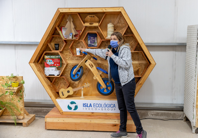 “Además del vivero y la compostera, armamos un stand con diversos proyectos sociales de economía circular que se producen en nuestra carpintería interna donde creamos entre otras cosas, patacletas, ukeleles y juguetes de cartón reciclado. Nuestro principal objetivo es poder producir pensando en las generaciones futuras”, comenta Lorena Eberhardt, Coordinadora de Medio Ambiente de Iveco Group.