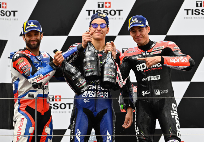 Por detrás, Rins amarró una cuarta plaza con sabor a podio que le permite igualar con Quartararo al frente de la general, mientras que Oliveira saboreó un Top 5 ante los suyos. Tras los hermanos Márquez, Bagnaia y ‘Polyccio’, el Top 10 lo completó Maverick Viñales (Aprilia Racing) para colocar dos RS-GP entre los más rápidos.