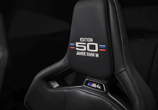 En el interior de todos los vehÃculos de edición basados ​​en el BMW M4 Coupé, paneles de los umbrales de las puertas con la inscripción «Edition 50 Jahre BMW M», una placa de metal en la consola central con la inscripción «M4 Edition 50 Jahre BMW M» y la impresión correspondiente en los reposacabezas de los asientos deportivos M de serie y los asientos tipo cubo M Carbon opcionales para el conductor y el pasajero delantero insinúan el aniversario.