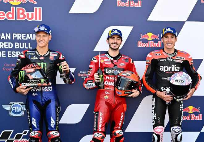 Una estrategia que le acabó reportando su primera victoria del año, convirtiéndose en el quinto ganador distinto en lo que llevamos de 2022. ‘Pecco’ firmó una carrera perfecta para destronar a un Fabio Quartararo (Monster Energy Yamaha MotoGP™) que había dominado las últimas ediciones celebradas en Jerez. La última plaza del podio, tras una preciosa batalla a tres bandas, fue para Aleix Espargaró (Aprilia Racing), tras superar a Marc Márquez (Repsol Honda Team) y Jack Miller (Ducati Lenovo Team).