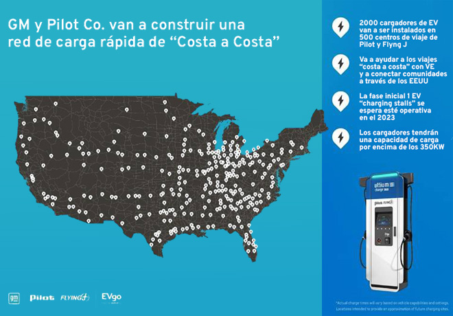 Esta red de 2.000 puestos de carga, con las marcas «Pilot Flying J» y «Ultium Charge 360», será impulsada por EVgo eXtend y estará abierta a todas las marcas de vehículos eléctricos en hasta 500 centros de viaje Pilot y Flying J. Los clientes de GM recibirán beneficios especiales como reservas exclusivas, descuentos en la carga, un proceso de carga simplificado a través de Plug and Charge y la integración en las aplicaciones de las marcas de vehículos de GM que proporcionan disponibilidad de cargadores en tiempo real y asistencia en la planificación de rutas. Se espera que esta colaboración mejore la experiencia de conducción de vehículos eléctricos en Estados Unidos.