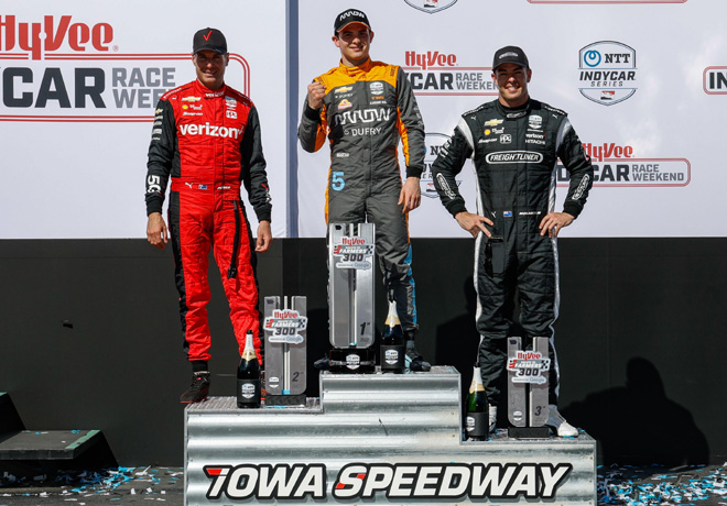 Pato O’Ward (Nº5 / Arrow McLaren SP / Chevrolet) ganó la segunda competencia del fin de semana en Iowa. El mexicano aventajó a Will Power (Nº12 / Verizon Team Penske / Chevrolet) por 4»2476 tras completar las 300 vueltas pautadas al óvalo de 0.894 milla. El podio lo completó Scott McLaughlin (Nº3 /  Freightliner Team Penske / Chevrolet).