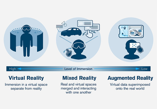 La MR es una combinación de VR y AR. La MR se caracteriza por la sincronización entre el mundo real y el virtual. Esto hace posible que los usuarios toquen y muevan los objetos virtuales con sus propias manos.