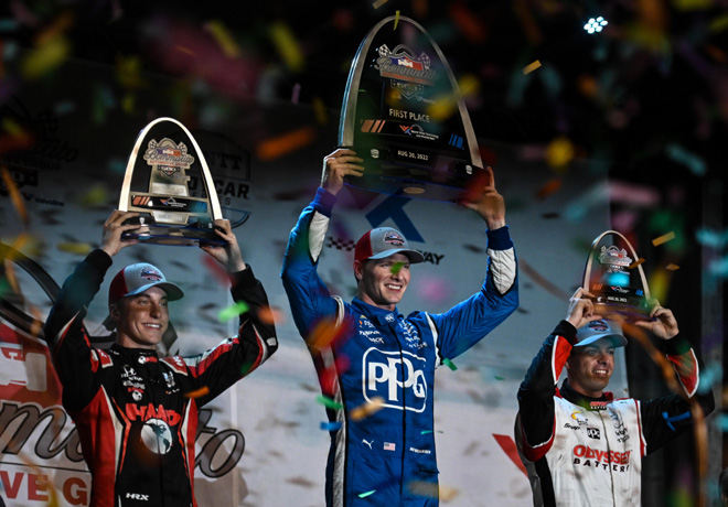 Malukas, cuarto, imprime un ritmo demoledor en el último tramo de carrera y va primero en busca de O’Ward cuando restan 17 giros. Ya tercero, descuenta la distancia con McLaughlin y logra superarlo en el giro final y por menos de medio segundo no logra superar a Newgarden que gana su quinta carrera del año en la última carrera de óvalo de la temporada.
