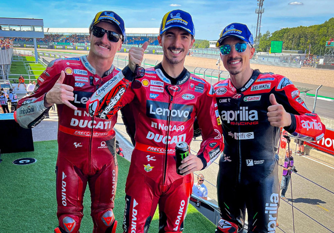 Sin embargo, la mayor parte de los focos los acabarÃa acaparando un Francesco Bagnaia (Ducati Lenovo Team) empeñado en poner la lucha por el tÃtulo al rojo vivo al recortar muchos puntos a los dos primeros de la general con su segundo triunfo seguido. En una carrera plagada de alternativas, ‘Pecco’ subirÃa a lo más alto del podio acompañado por Maverick Viñales (Aprilia Racing) y su compañero, Jack Miller.