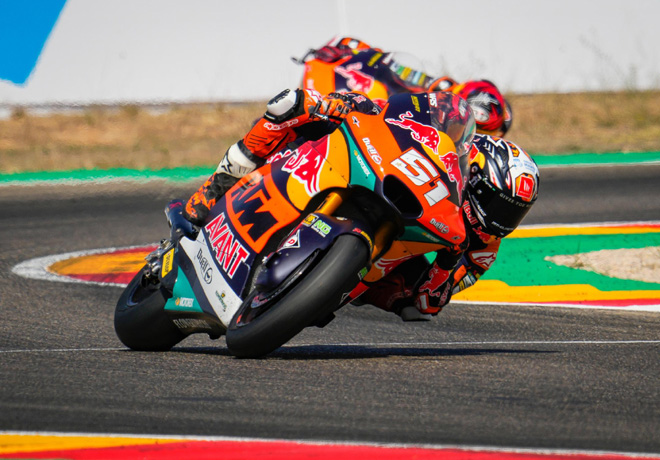 El paso de las vueltas confirmarÃa el guion del mano a mano final entre los dos futuros compañeros en el equipo de fábrica de Ducati. A falta de 10 vueltas, consumaban su renta de más de un segundo sobre un Binder que amagaba con dejar atrás a Aleix. Nada más lejos de la realidad, ya que el de Granollers irÃa de menos a más con el paso de las vueltas. Varias vueltas después, la renta entre Bagnaia y Bastianini empezaba a estrecharse de nuevo. Comenzaba a hacerse patente la caÃda del neumático, un escenario en el que ‘La Bestia’ se mueve a la perfección. A falta de 5 giros, la renta se reducÃa a 3 décimas, mientras Binder comenzaba a verse encimado por Aleix