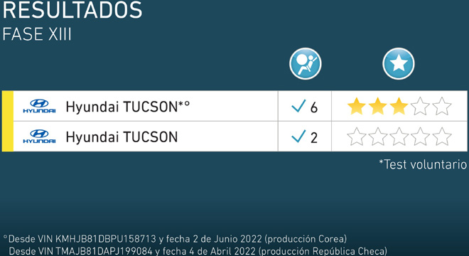 El Hyundai Tucson, producido en Corea y República Checa, con dos bolsas de aire frontales de serie, fue calificado con cero estrellas. El SUV alcanzó 50,23% en Protección Ocupante Adulto, 5,34% en Ocupante Infantil, 48,40% en Protección a Peatón y Usuarios Vulnerables de la Vías y 6,98% en Sistemas de Asistencia a la Seguridad.
