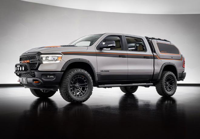 Diseñado a partir de la Ram 1500 TRX de 702 caballos de fuerza, la pickup más rápida y potente del mundo, de quien hereda la velocidad y la solidez necesaria para superar tramos todoterreno en un tiempo récord, este concepto se caracteriza por un exterior pintado en una llamativa combinación color amarillo y negro satinado con unos enormes gráficos laterales TRX.