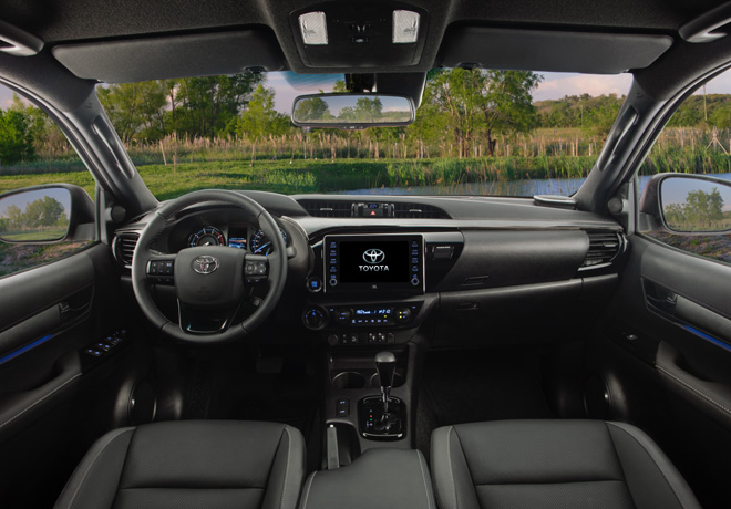 El interior de Hilux Conquest se destaca por un diseño exclusivo que combina diferentes colores: negro, cromado oscuro y símil acero cepillado. Las puertas tienen iluminación led de color azul, que se complementa con el diseño del cuadro de instrumentos. Además, dispone de un sistema de audio multimedia con pantalla táctil de 8” y conectividad Android Auto y Apple CarPlay la cual se encuentra disponible solo por conexión USB en smartphones compatibles. También incluye un sistema de audio premium JBL con un total de 8 parlantes y subwoofer.