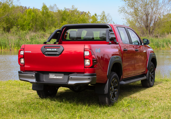 La Hilux Conquest se distingue, frente al resto de variantes de la gama Hilux, por una serie de elementos distintivos como los espejos exteriores, las manijas de las puertas, las molduras de ventanillas y los overfenders en color negro. Las llantas de aleación de 18 pulgadas y con diseño exclusivo están equipadas con neumáticos 265/60R18.
