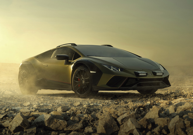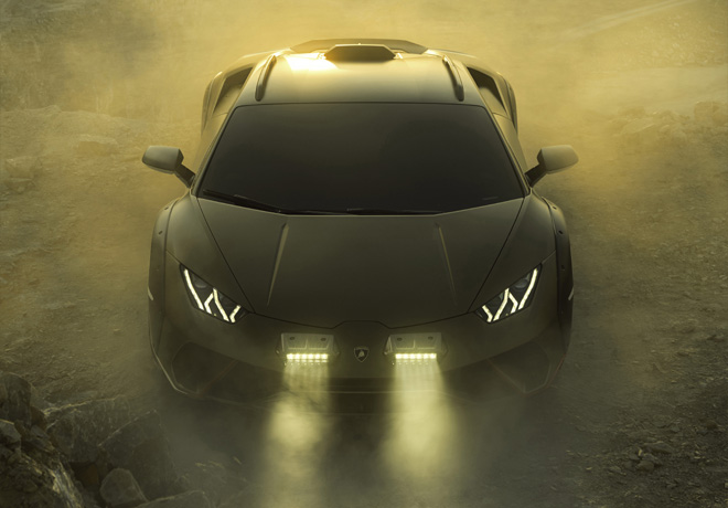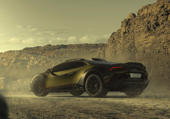 El exterior muestra el espíritu aventurero del Sterrato desde el primer vistazo. La distancia al suelo fue incrementada 44 mm en comparación con el Huracán EVO para garantizar un mayor recorrido de la suspensión, al igual que el ancho de vía delantero (+30 mm) y trasero (+34 mm).