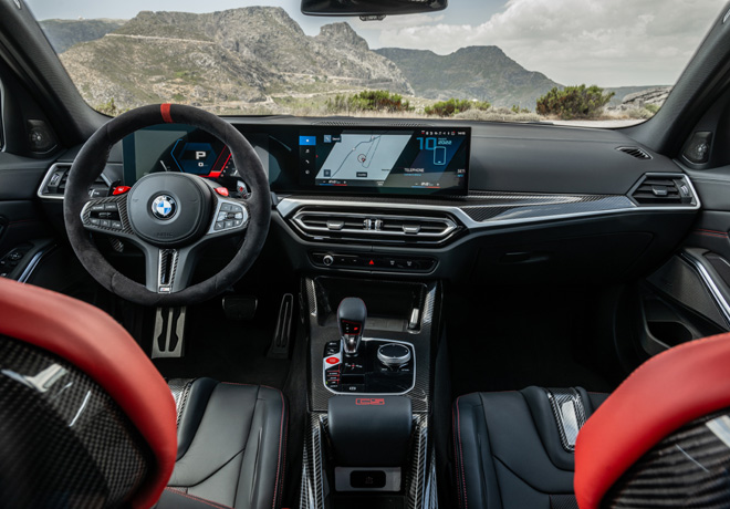 La lista de equipos de serie para el nuevo BMW M3 CS también incluye cinturones de seguridad M con un patrón de rayas tejidas en los colores de BMW M GmbH, umbrales de las puertas con la inscripción «M3 CS», un revestimiento del toldo de color antracita, tiras interiores con acabado de fibra de carbono y un volante M de Alcantara con paletas de cambio CFRP y un marcador central rojo.