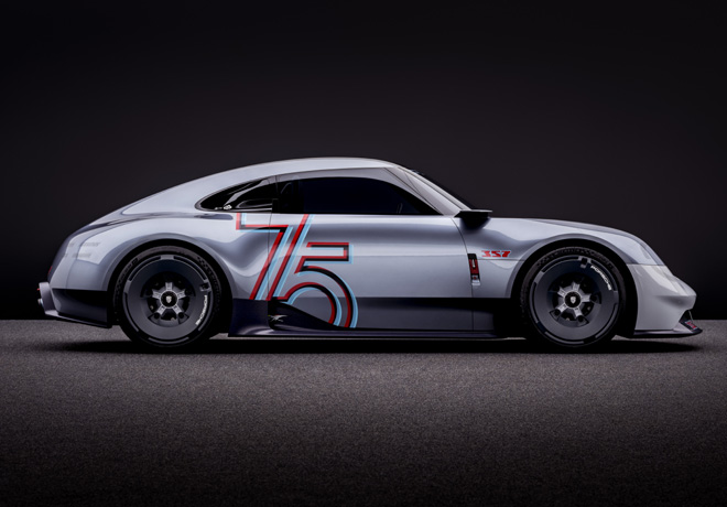 El logotipo de los 75 años adorna las puertas y la parte delantera como en un auto de carreras. No es el único detalle procedente del automovilismo deportivo: no hay nada detrás de la zona inferior de las ruedas delanteras, lo que permite una mejor ventilación en los guardabarros. El capó delantero envolvente y sin juntas se sujeta con mecanismos de cierre rápido. Unas barras roscadas estabilizan el gran spoiler delantero. En los estribos laterales, los diseñadores de Porsche emplearon polímero reforzado con fibra natural (NFRP), como en el Porsche Mission R, el prototipo de un auto de carreras GT totalmente eléctrico presentado en 2021. La base de estos materiales sostenibles son las fibras de lino procedentes de plantaciones agrícolas. En lugar de retrovisores exteriores tradicionales, el estudio de diseño está equipado con cámaras en el borde del techo. La salida del tubo de escape visible en la parte trasera es de titanio de aspecto azulado, mientras que el interior del tubo es cerámico.