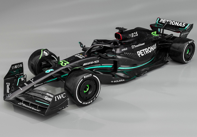 La última creación de Mercedes marca un regreso al negro, un color que utilizaron anteriormente en 2020 y 2021, después de pasar 2022 en su esquema plateado más tradicional.