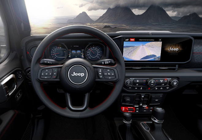 Una pantalla táctil completamente nueva de 12.3”, la pantalla más grande y avanzada jamás ofrecida en un Wrangler, permite gestionar el premiado sistema Uconnect 5 de quinta generación y ocupa un lugar destacado en la parte superior de la consola central, justo encima de la nueva salida de aire rectangular. Las salidas de aire exteriores conservan su característica forma circular.