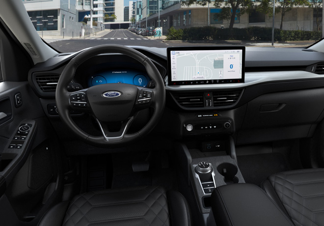 La Nueva Kuga Híbrida ofrece una experiencia digital inmersiva a través de tres pantallas, incluyendo un nuevo sistema multimedia SYNC 4 con una nueva pantalla táctil de 13,2” compatible con Android Auto y Apple Car Play con conexión inalámbrica, un panel de instrumentos digital configurable de 12,3” y un head-up display que muestra informaciones sobre la velocidad, navegación y asistencias a la conducción. El sistema de audio premium B&O cuenta con 10 parlantes y subwoofer, y cuenta con cargador de smartphone inalámbrico.