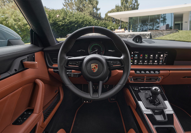 El interior también cuenta con una parte central de los asientos tapizada en tela en Classic Cognac con rayas negras, que es otro homenaje al legado de la marca. Completan el conjunto el acabado en cuero bicolor en Negro/Classic Cognac, un revestimiento de techo en Dinamica perforada y otros elementos de Porsche Exclusive Manufaktur. El logotipo de Porsche y la designación del modelo 911 S/T en la parte trasera del automóvil están en dorado.