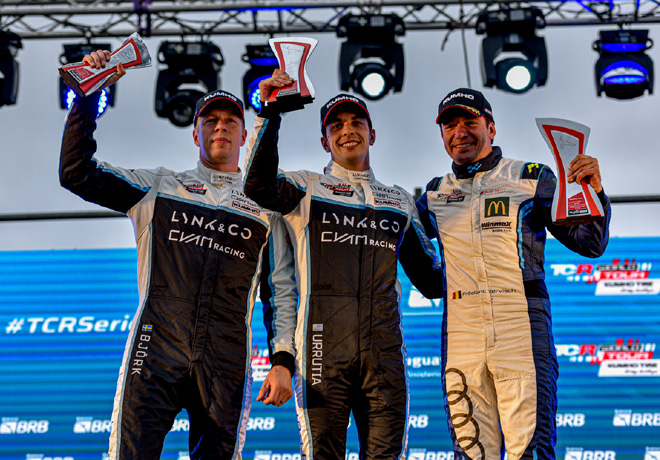 Cumpliendo con el concepto TCR, las dos carreras tuvieron el atractivo de 28 autos en pista sumando a los de la categoría mundial y la sudamericana. Por la mañana, el local Urrutia partió desde la pole y no abandono el primer lugar hasta la bandera a cuadros. El uruguayo pudo controlar a su compañero de equipo, el sueco Thed Bojork, que finalizó en segunda posición y al belga Frédéric Vervisch que completó el podio.