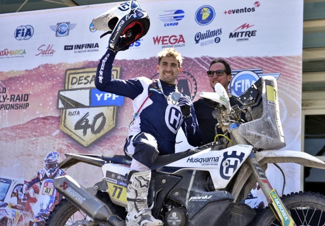 La cuarta fecha del Campeonato del Mundo de Rally Raid concluyó este viernes en la ciudad de Salta, con el festejo de los ganadores de todas las categorías. Tosha Schareina (Honda Team) se quedó con el triunfo de la carrera pero Luciano Benavides (Husqvarna Racing Factory) logró el mejor resultado en la categoría RallyGP. Nasser Al Attiyah y Matthieu Baumel (Toyota Gazoo Racing) fueron los ganadores en Autos y Manuel Andujar (Yamaha) fue el mejor en Quads.