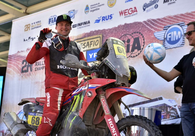 Tosha Schareina (Honda Team – Ganador de la carrera en motos): «Es un orgullo estar en Argentina y qué mejor forma de estar aquí por primera vez que con una victoria. El apoyo de toda la gente es inhumano. Ha sido una carrera super completa. Esto es rally y hasta el ultimo momento no sabíamos qué iba a pasar, había que apretar los dientes y lo hemos hecho».