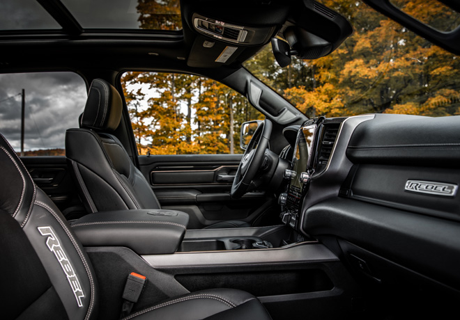 Los ocupantes de la nueva Ram 1500 Rebel encontrarán un interior totalmente renovado y sumamente sofisticado. Galardonado como uno de los mejores diseños de cabina en EEUU poco después de su lanzamiento, se destaca su techo panorámico de doble panel, los asientos revestidos en cuero y el panel de instrumentos sumamente completo. Todos los asientos son calefaccionados y los delanteros incorporan regulación eléctrica. El volante posee controles multifuncionales y los pedales también son ajustables. En las plazas