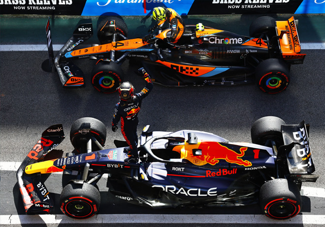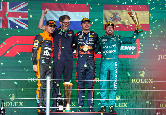 Fue otra fuerte escapada de Verstappen en el reinicio, quien resistió el desafÃo de Norris para mantener la primera posición antes de lograr su segunda victoria del fin de semana después de vencer en el Sprint del sábado. Norris consiguió un sólido segundo puesto, mientras que Alonso completó el podio tras contener a Sergio Pérez en una emocionante batalla hasta la meta.