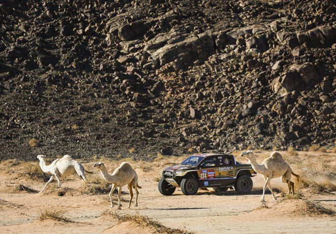 Finalmente no fueron los neumáticos los que le hicieron detenerse, sino un impacto brutal que le rompió la transmisión delantera derecha en el kilómetro 132. Sin solución inmediata, el alsaciano tuvo que esperar a la asistencia, lo que le obligó a renunciar a un montón de horas. Pero la providencia llegó en forma del Hunter del piloto chino Yungang Zi, que cedió amablemente la pieza que ha permitido al campeón conservar su puesto en el podio. Todavía le quedaba llegar a la meta sin demasiado retraso y evitar los pinchazos. Al final de la jornada, Loeb tuvo que detenerse un total de tres veces y acabó la etapa con las ruedas en un estado lamentable, pero hizo lo suficiente como para salvar su tercer puesto y con 7 minutos por delante de Guerlain Chicherit.