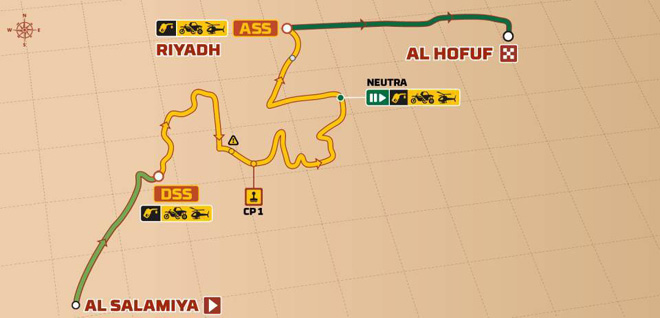 Otra larga jornada para llegar a Al Hofuf, situado en el centro de un inmenso oasis plantado con tres millones de palmeras datileras. Para compensar el extenso kilometraje de la etapa, sobre todo al final de un maratón, se ha rebajado un poco el nivel de dificultad del terreno, que es bastante rápido. En cambio, la navegación será muy complicada, como lo fue la víspera. Es aquí donde algunos pilotos y equipos perderán algunos preciosos minutos, o incluso más.