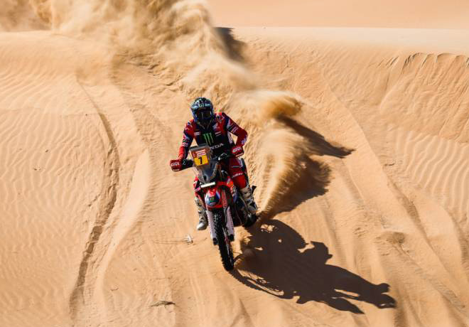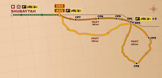 Los motoristas de élite que luchan por el título nunca han rodado ocho horas en una especial… hasta ahora. El escenario de esta primicia será el Empty Quarter y sus dunas infinitas. Aunque ya se han adentrado en esta zona, el recorrido de esta mega-especial es realmente duro. Entre los cordones dunares les esperan los chotts (lagos salados), donde podrán tomarse un respiro. Pero la navegación exigirá el máximo cuidado, con rumbos difíciles de encontrar y WP ocultos que enrabietarán a muchos: «No voy a hacer muchos amigos», comenta David Castera. De hecho, sus antiguos camaradas de la categoría de coches se enfrentarán a las mismas dificultades que los pilotos de dos ruedas. Además, como los recorridos de la FIA y de la FIM son independientes, no habrá marcas de rodadura de motos para guiar a los copilotos.