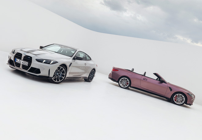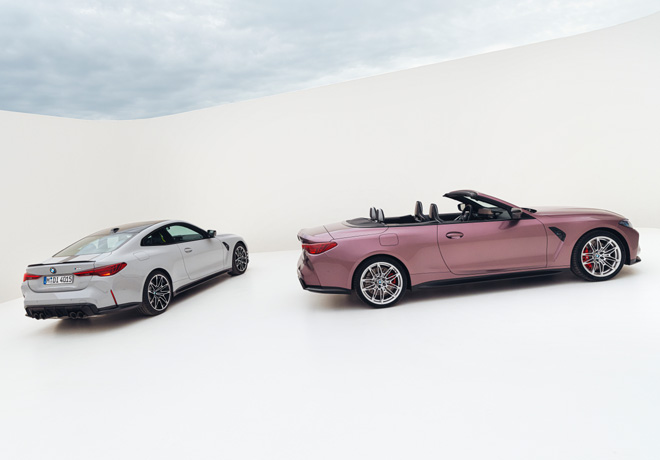 El BMW M4 Competition xDrive en versiones Coupé y Convertible (la disponibilidad de versiones depende de cada mercado) ganan 20 hp adicionales cada uno. Toda la lÃnea M4 recibe nuevos faros delanteros, luces traseras mejoradas con láser, rines de aleación ligera forjados M con un nuevo acabado plateado brillante y nuevos interiores digitales avanzados con el BMW Curved Display con iDrive 8.5, nuevos volantes y acabados interiores.