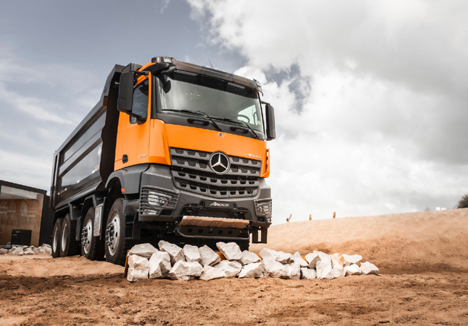 La robustez y aptitudes fuera de ruta del Arocs residen en su chasis con un ángulo de ataque y salida de 30 grados, mejorías en los despejes respecto al suelo, con vano libre en el eje delantero de 455 mm, características que le permiten transitar y maniobrar sin problema en terrenos difíciles. Con un peso bruto de 48 toneladas, este camión ofrece una carga útil máxima de 36,1 toneladas.