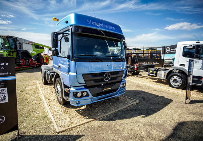 El camión de producción nacional Atego 1729, exhibido en el stand tanto en su versión con chasis carrozado como tractora, es uno de los más utilizados para el trabajo agrícola, realizando el transporte de mediana y corta distancia de granos, frutas, verduras, mercaderías generales, cargas palletizadas, entre otros.