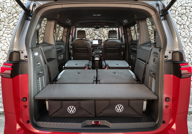 El Baúl GTX. El volumen del baúl del ID. Buzz GTX (con distancia entre ejes estándar) en la configuración para cinco ocupantes se sitúa entre 1.121 litros (hasta el borde superior de los respaldos traseros) y 2.123 litros (asiento trasero abatido, hasta el borde superior de los respaldos delanteros). El ID. Buzz GTX versión extendida es aún más espacioso: cargado hasta el borde superior de los respaldos de la segunda fila de asientos, hay 1.340 litros disponibles. Si se carga detrás de los asientos delanteros y su volumen alcanza los 2.469 litros. Incluso con siete personas a bordo, la tercera fila de asientos del ID Buzz tiene capacidad para 306 litros en la parte trasera. Dependiendo de la configuración de los asientos, ambos ID. Buzz GTX pueden equiparse con una plataforma Multiflex larga o corta (incluidas dos cajas plegables). La plataforma Multiflex crea un segundo nivel para la carga y, cuando los asientos traseros están abatidos, un área de carga plana.